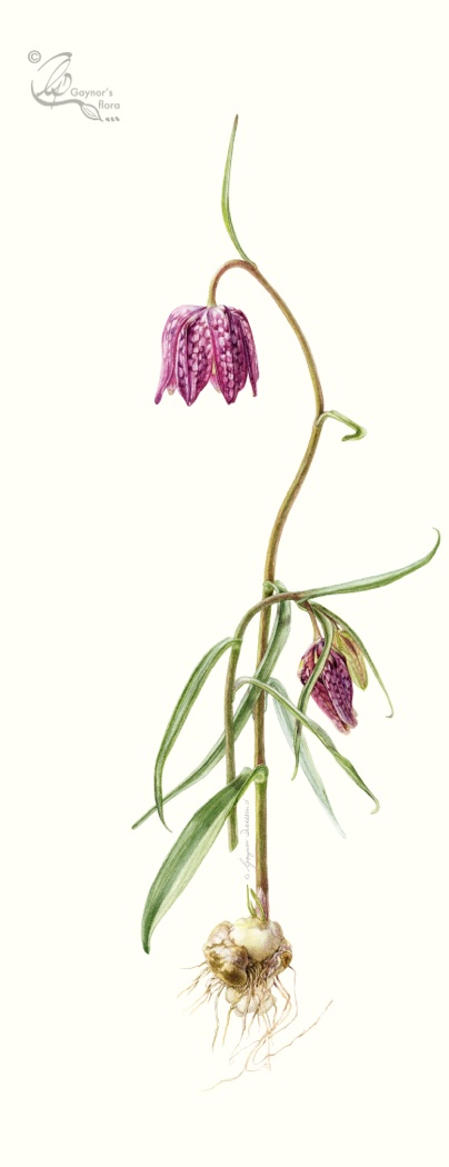 A friend gave me quite a few fritillary bulbs from his own garden and they now thrive in our old garden in Bosham. It was from these bulbs that this painting was created.