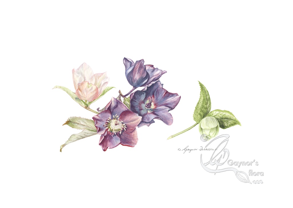 As with several of my small paintings the picture started as a demonstration for a workshop on Hellebores. I had lots of different Hellebores in my garden therefore for a change chose to paint them face up in a bowl of water. Normally the flower hangs its head and you have little opportunity to see the delicate stamens or fertilised carpels under the cap.