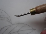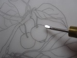 I then place the traced image right side up, on my art paper ( normally Fabriano HP) and, using a Decoupage tool, I rub across the lines. This transfers the graphite from the back side of the tracing paper to the art paper.