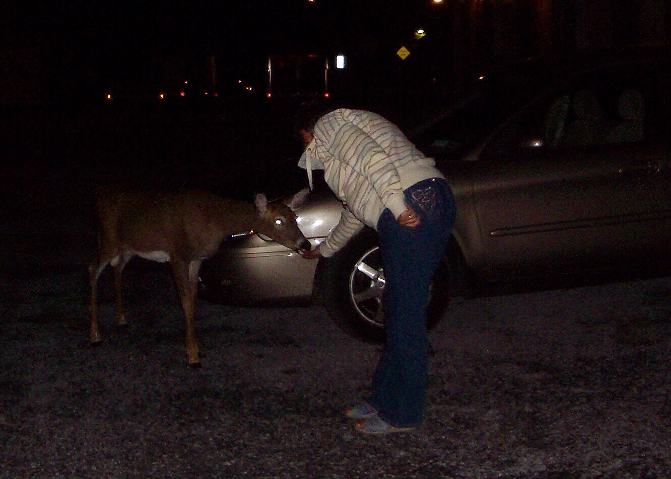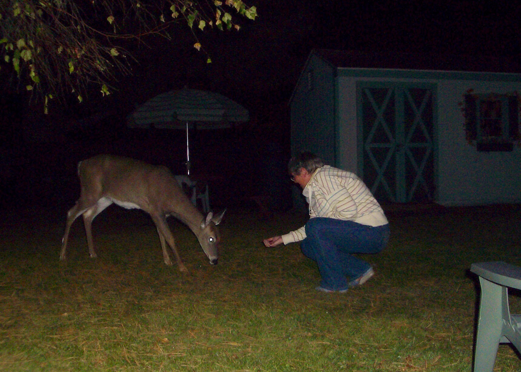 We see white tailed deer every day, mostly in the early morning or evening. They seem to like eating apples and crab apples fallen from the trees in gardens. No-one seems to mind this at all. One isn’t allowed to feed them and I haven’t seem them rummaging for food. This evening when we came back from eating our supper, one appeared outside our door. I happened to have a handful of crab apples I had picked, so held them out – not really expecting the deer to come over to me. It did. So Robin took these pictures. It is such a privilege to have a wild animal feed from your hand.