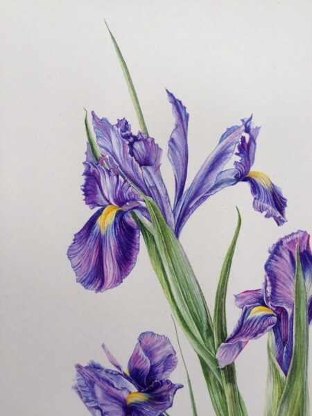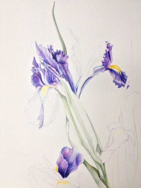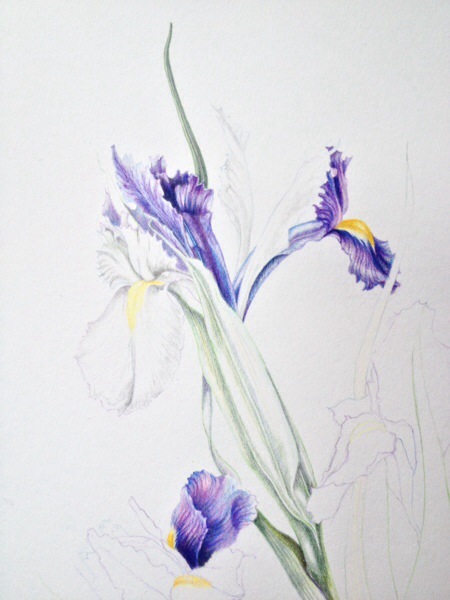Do you remember the Irises that I did in watercolour and then demonstrated in coloured pencil at Westminster? I have continued with that today and will be using the same to demonstrate on Sunday. I think I have been doing myself a disservice in trying to keep it true to the watercolour as it is quite different to the iris I am now painting from. I’m tying myself up in knots.