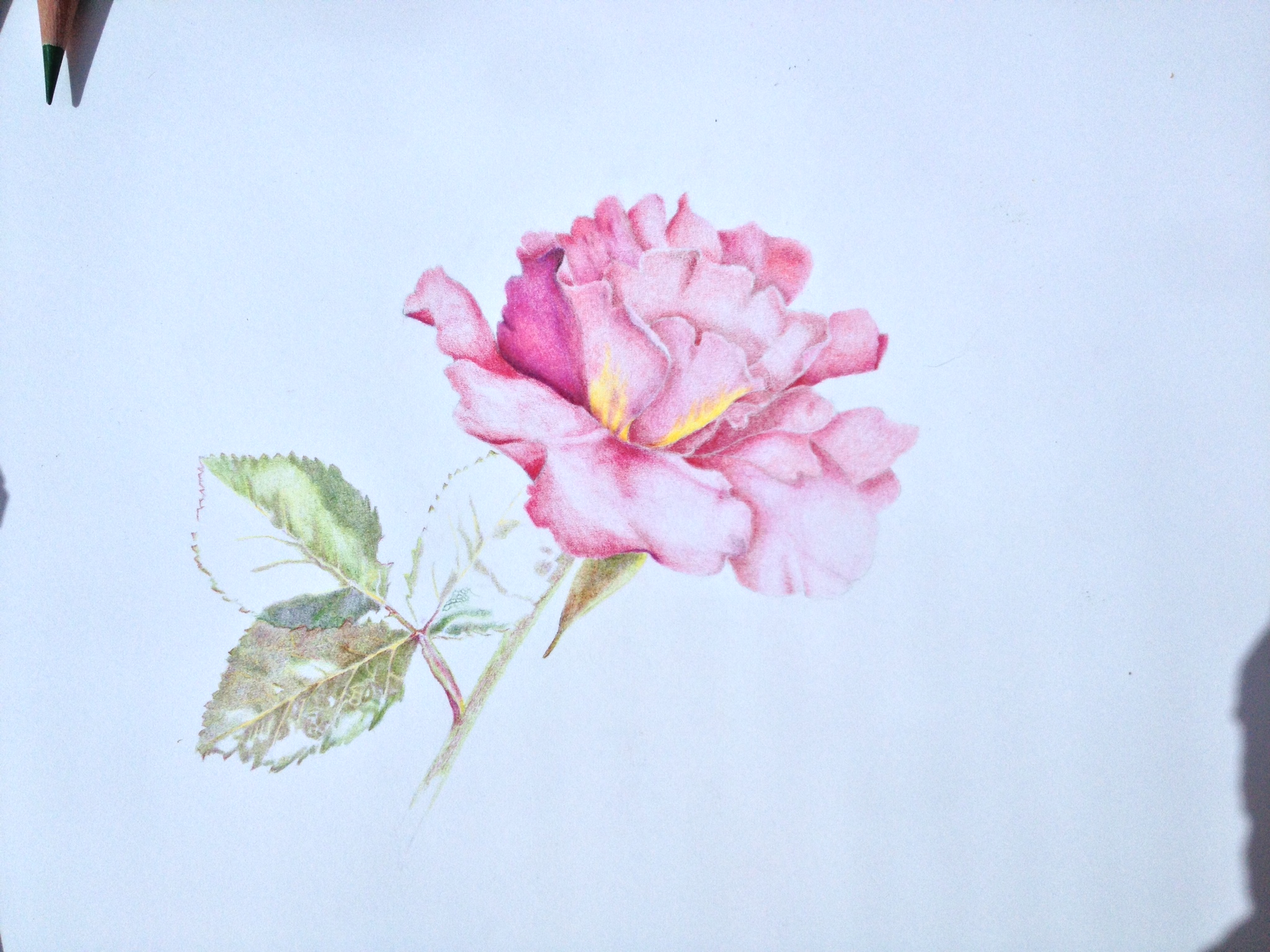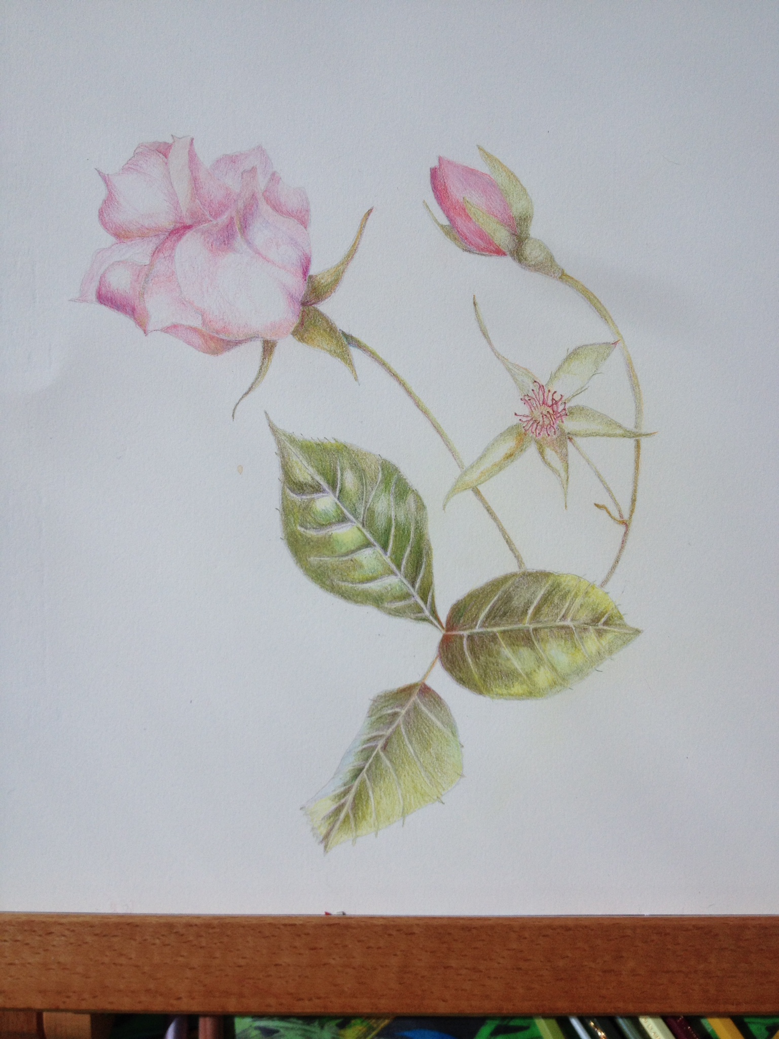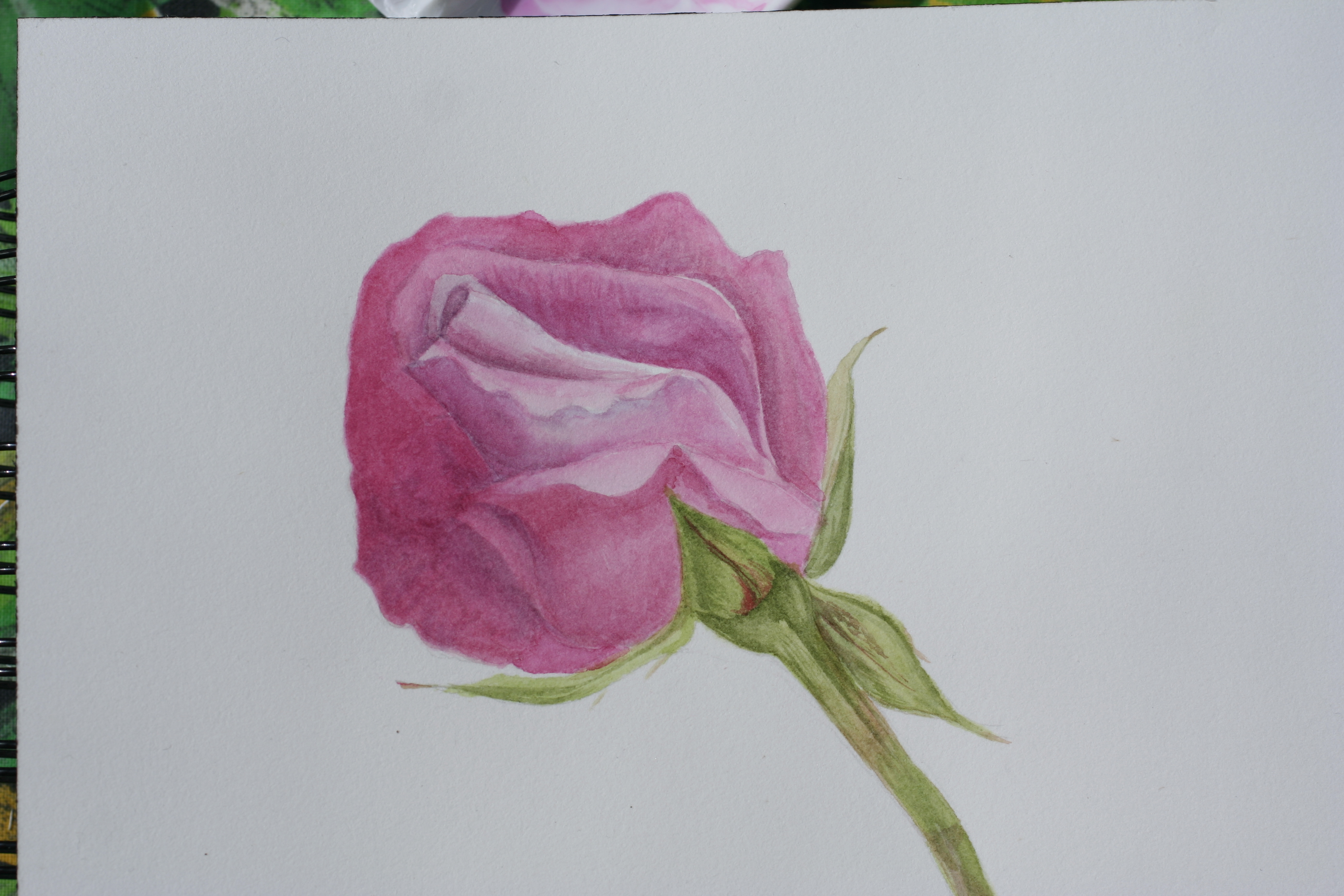 That night the one rose disintegrated entirely! The student painting it felt a little despondent, but we looked up the garden and there, in front of us was an absolutely splendid open bud. The petals were rich and velvety and we couldn’t believe our eyes. The flower lasted that day and long enough for her to complete it. Luckily, there were plenty of leaves available.