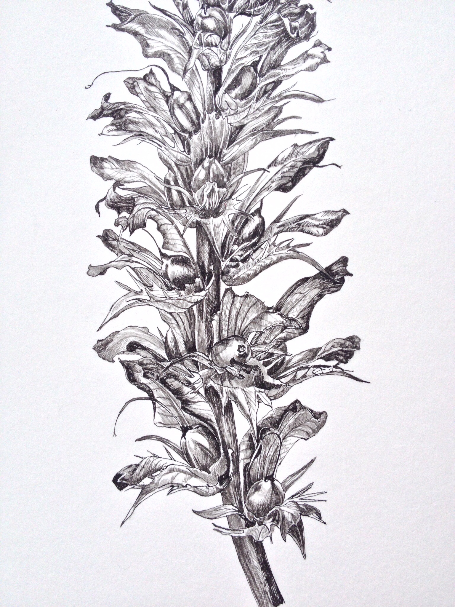 My last blog mentioned that the botanical art exhibition at Palmengarten is now less than a week away. Each day that comes I think that I might get a little painting in before we go – but no such luck. I will show you a couple more pictures from the pen and ink drawing of Bear’s britches progression though.