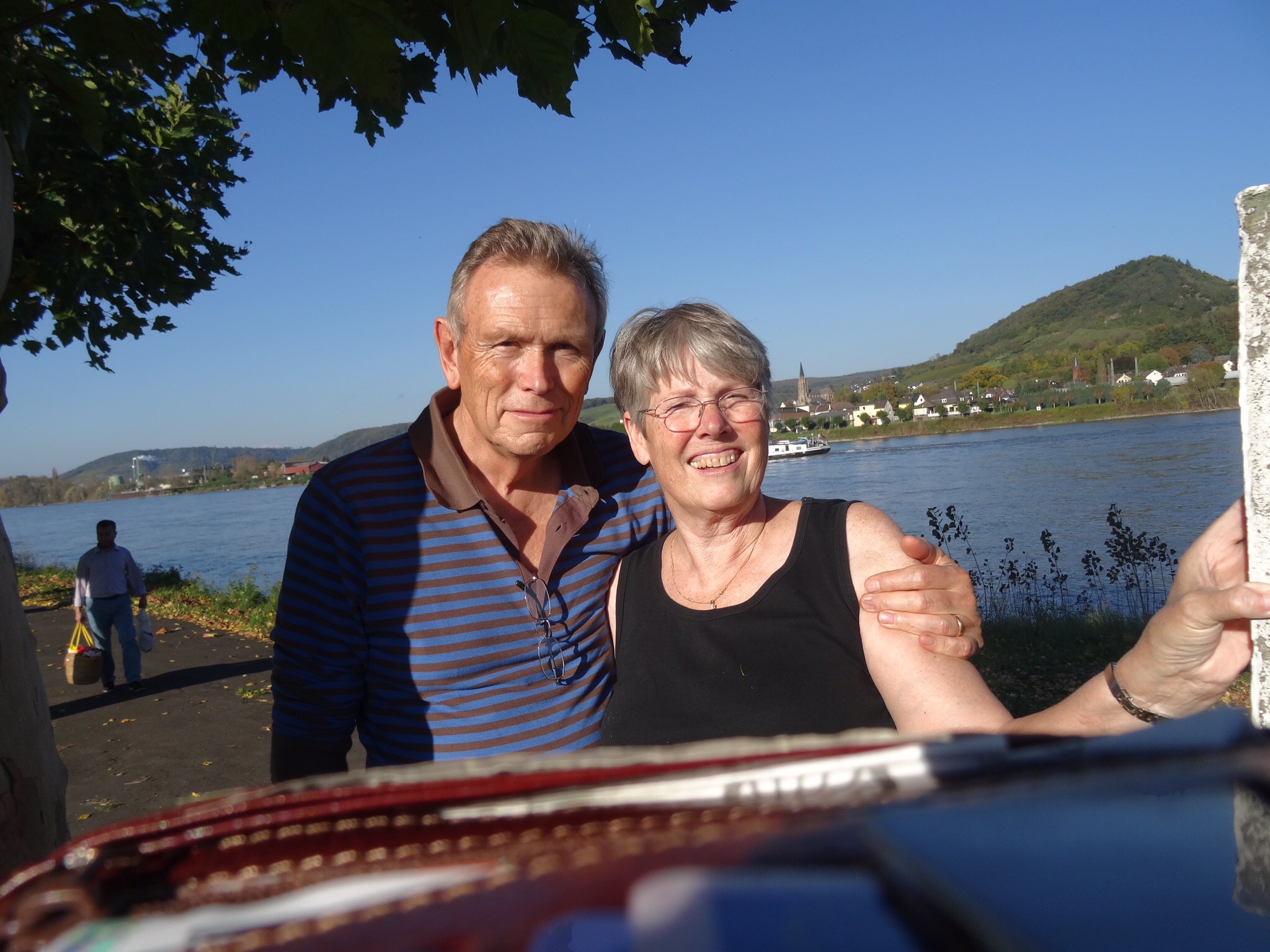 The driver and companion stretching legs by the Rhine.