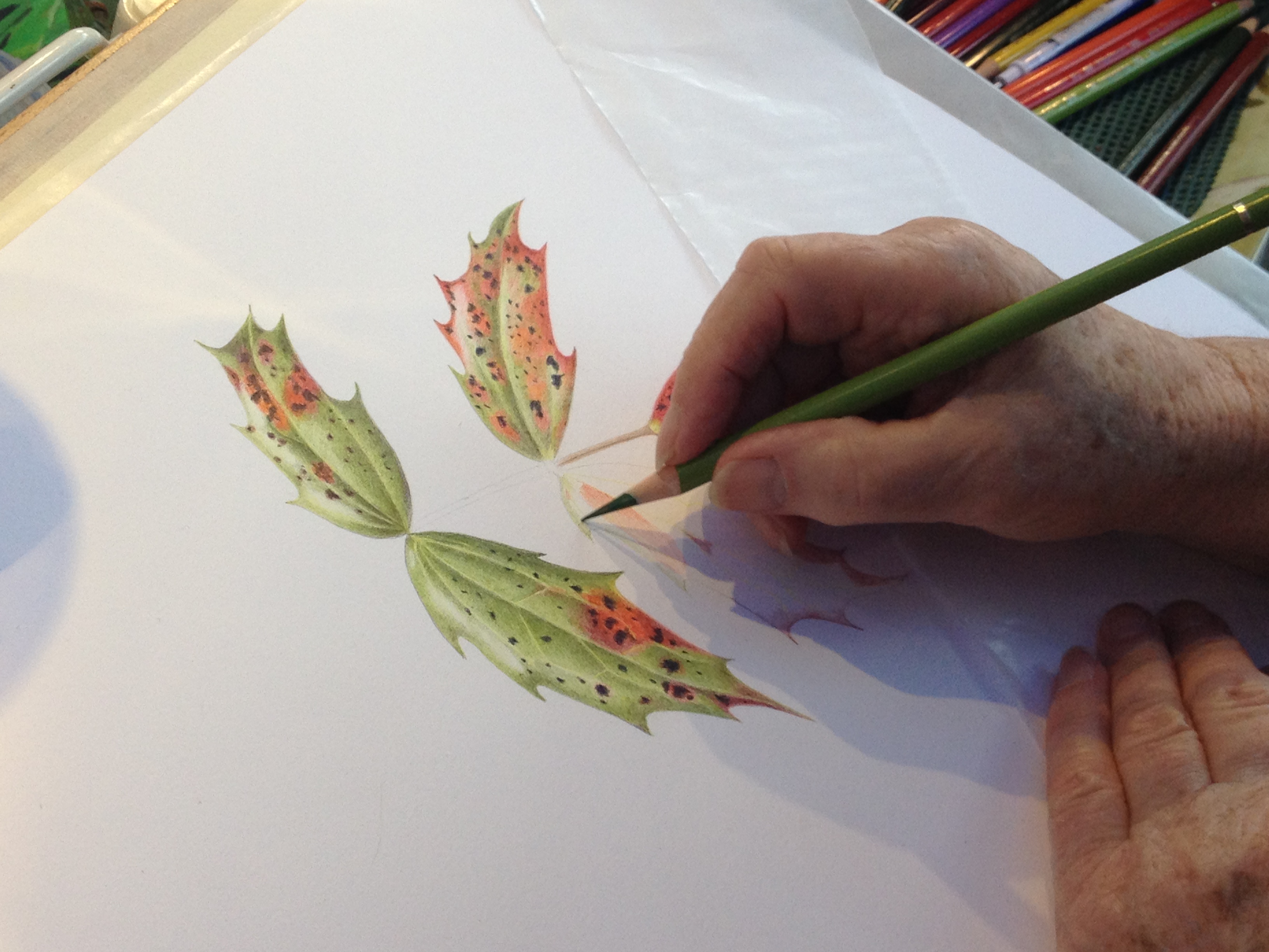 The last one shown below is the Honeysuckle. I think you might be able to understand the quandary the artist has when painting this picture. We are now in mid November, she has found this Honeysuckle still flowering, but knows that its days are numbered. In addition to the limited supply, she also wants to get done that part of the plant that is likely to die first – the flowers. This is typical of all botanical art painted from a live subject – what do you paint first and what is likely to change most?