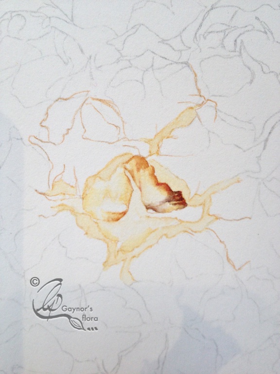 I normally take pictures of my subject first so that I have an idea of what it originally looked like, so that when it dies or rots too much, I can replace it with a fresher specimen. In this instance my original drawing and placing of segments will be different to any other pineapple I get. But, I can use segments in the new pineapple, making sure that they are in a similar position and lit in a similar way to the original specimen. Thus I can continue to paint from life – which for a botanical artist is far the best thing to do.