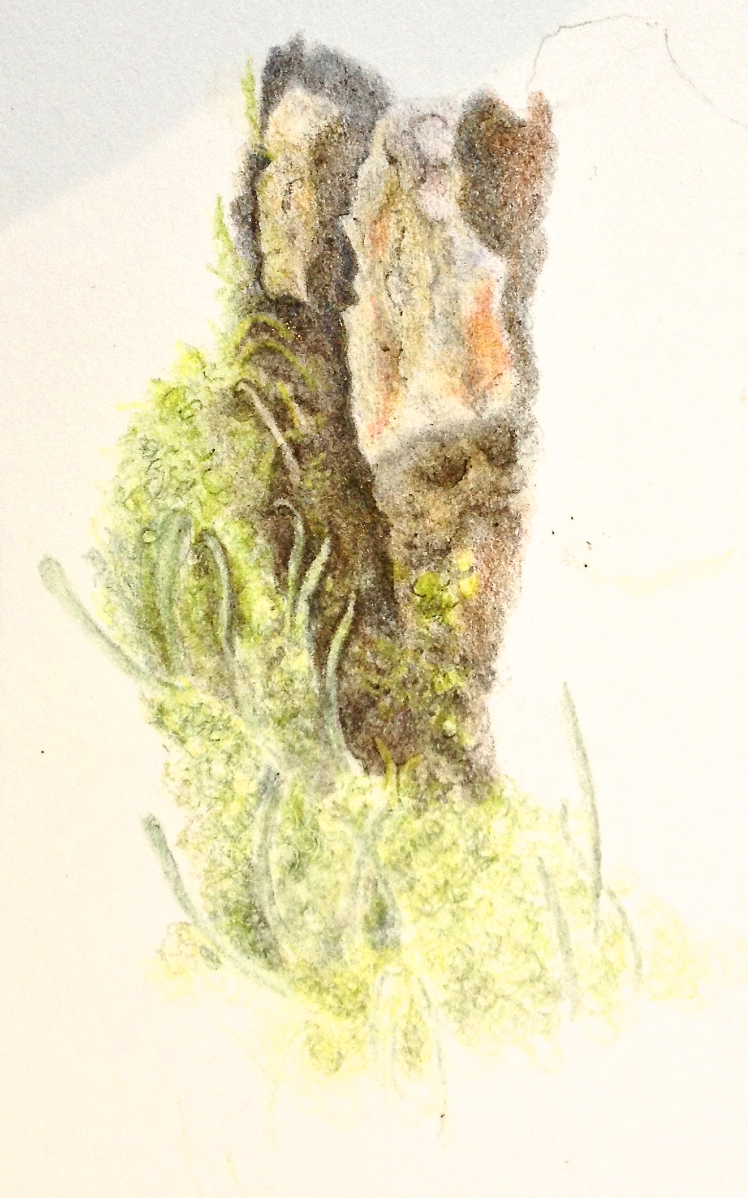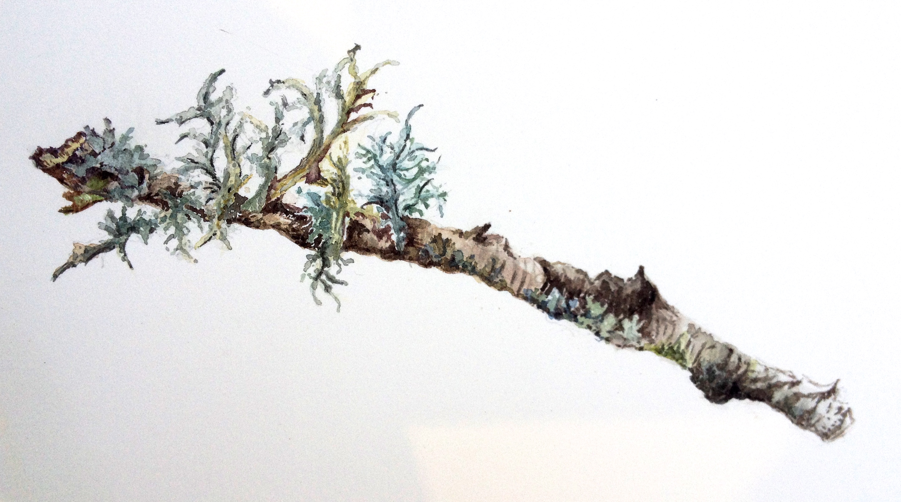 When painting a serious botanical subject that has gnarled branches with lichen or moss growing on it, I feel that I can play with the painting of it – as long as I stay true to the form, growth habit and type of lichen etc. I wanted to convey this to the group as well as get them to see the multitude of colours within such a specimen. I had two days to do this. Half of the group worked with watercolour and half with coloured pencil. Therefore it was exciting demonstrating the same topic in each of the media.