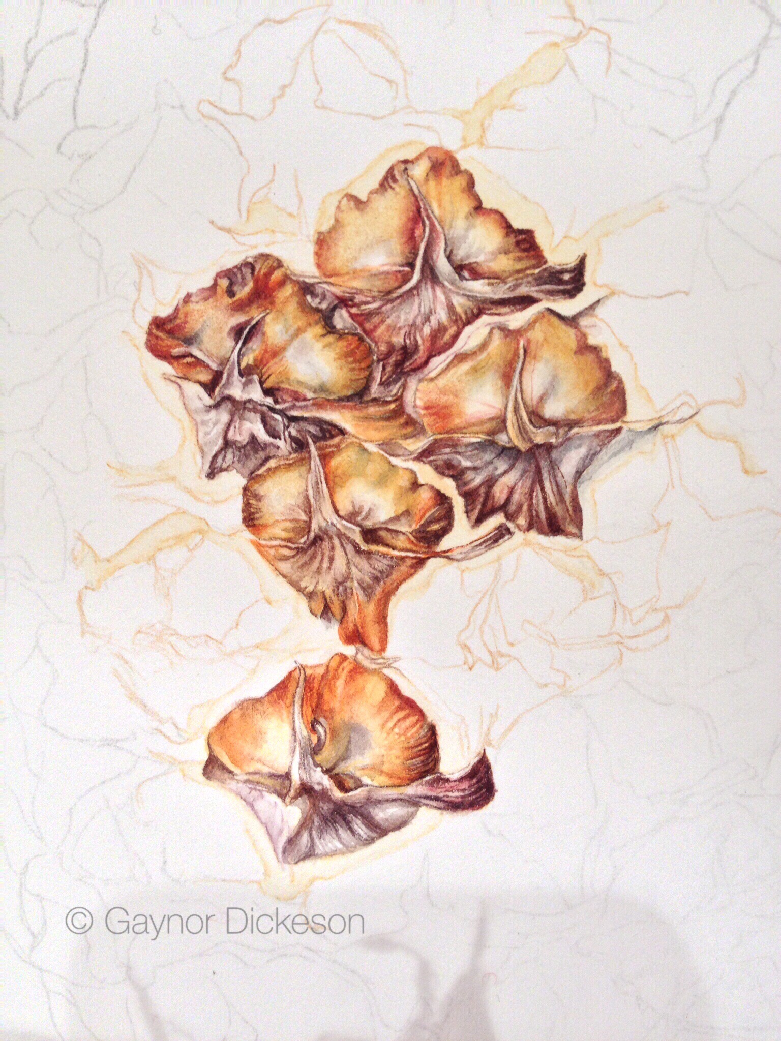 I mentioned that I take pains to draw the pineapple and arrange the segments appropriately. Once that is done I transfer this to my watercolour paper. But what happens then, particularly when I have to change pineapples? This is why I draw the segments in so they can easily be adjusted. I paint from life, therefore when I begin a new pineapple, I place it in such a position as to be able to find segments facing the same direction as on my original drawing.
