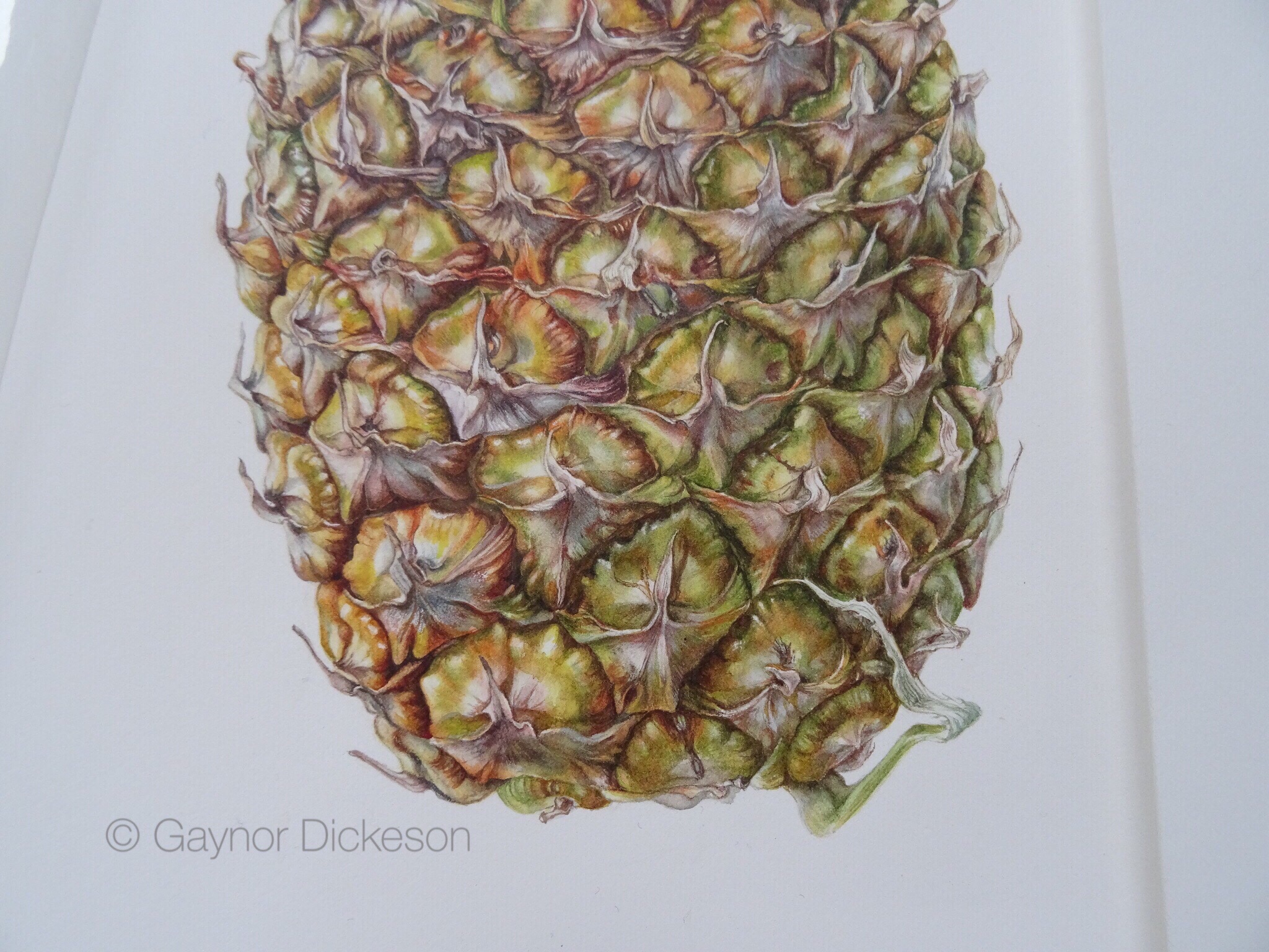 From the fruit to the leaves. I read somewhere the other day about someone needing to get into the ‘zone’, when painting a picture. That really struck me with this pineapple, because it was so different from the last piece of work I did. It had to feel right before I actually started putting paint on the paper. I had to feel confident that the colours I was going to use were the right ones, and that the sequence of colours and the way I laid them, were right for this picture too.