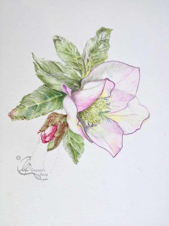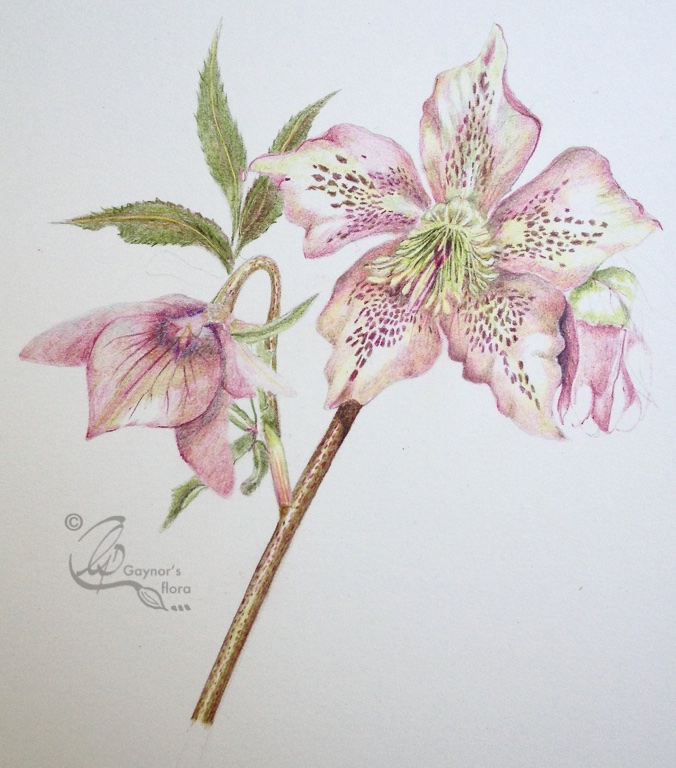 I promised to show the Hellebores following the botanical art workshop at the weekend. Unfortunately I couldn’t do it before now as one student came back during the week for a class – taking advantage of being on holiday in the area; one went back to Norway; and one wanted to do some more at home after the workshop. However, here they are. I am really pleased with the pictures so far. All the students decided to use coloured pencil, but painting Hellebores face exposed is not easy, whether using watercolour or coloured pencil. There is a lot of detailed work.