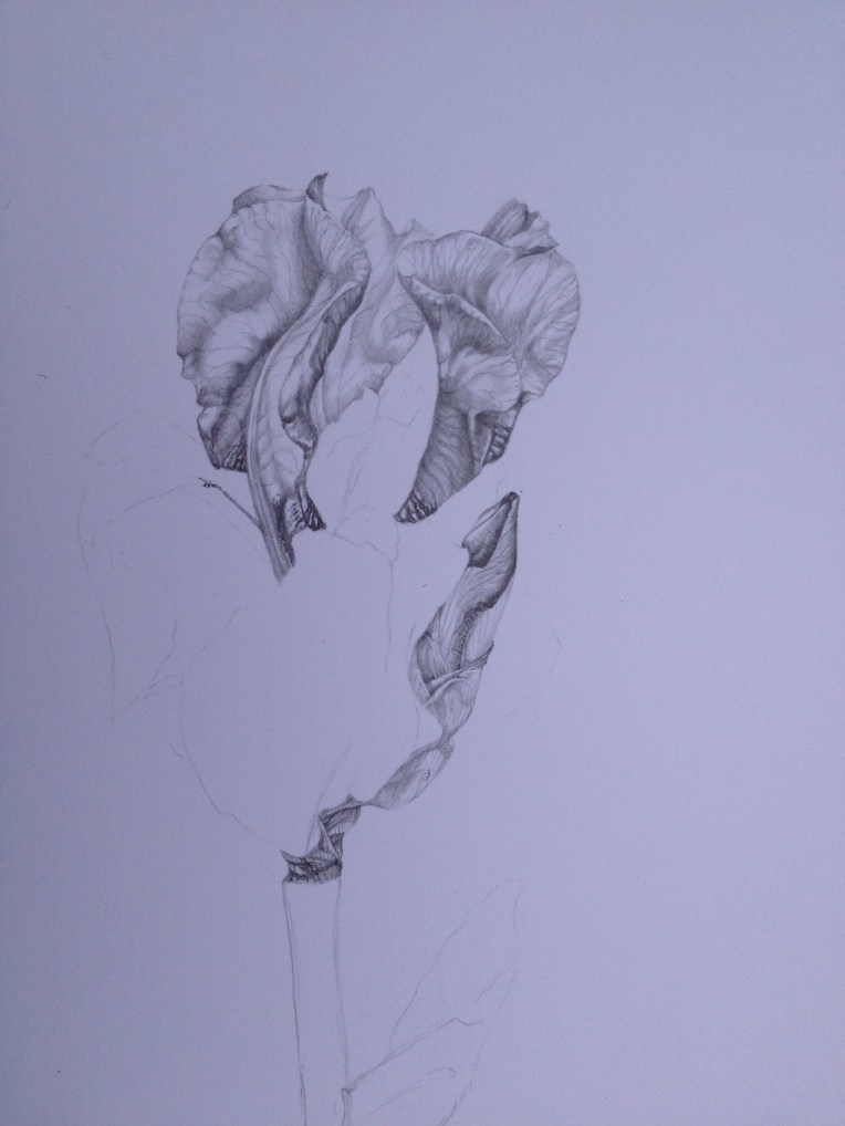With my new wide brimmed hat I now had an opportunity to paint, or knit, or read or fall asleep. I had brought with me the Bearded Iris that I was drawing in graphite at the SFP demonstration on Thursday. I could if I wanted to, do a little more on it if I chose to. As it was a graphite picture, I could actually do it whilst sitting in the garden – so that’s what I did.
