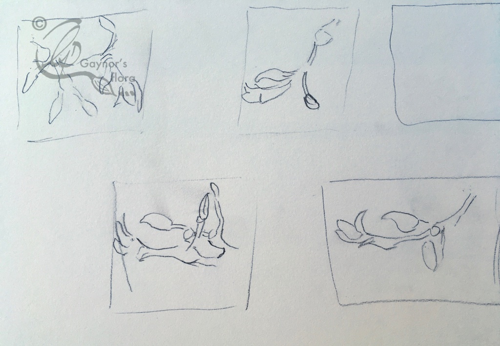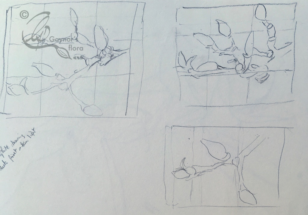 This time, as I knew everyone from previous workshops (normally there is at least one new person), they felt it was OK for me to concentrate more than usual on the compositional aspect of botanical art. They duly did their thumbnails and decided which one they would focus on to create their line drawing. I am going to show you the progress of one student from thumbnails to where she got to today.