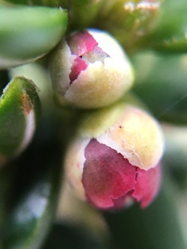 I also want to share with you the excitement I have felt recently because of one of my plants from Norway. It is called Empetrum nigrum; hermaphroditum (Krekling in Norwegian or Crowberry in English). Normally this plant is either male or female, but at high altitudes it has both sexes in the same plant. During the autumn my plant developed some flower buds. But nothing else happened until this last week when a couple of them started opening and showing petals.