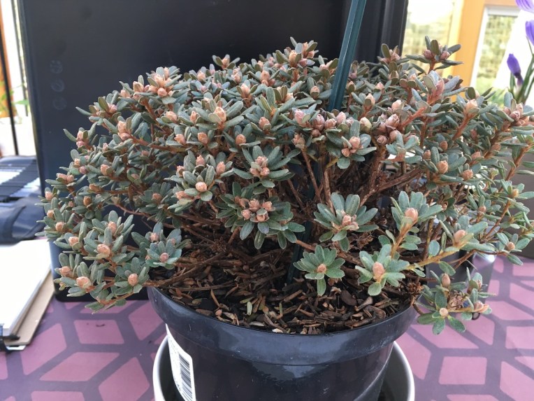 My project for the Chelsea Florilegium this year is the Rhododendron impeditum. It is an exquisite dwarf Rhododendron. Why I do such tiny plants, I have no idea. I spend a lot of time trying to think out how I am going to portray it even before I start. I know that it won’t be easy but at the moment I am doing as many sketches of it as possible before the buds open. Initially the buds looked fairly dead and in fact the winter did kill off my first plant and killed the buds of the 2nd plant. Luckily I managed to find a 3rd one, so my sketches so far have been from this one.