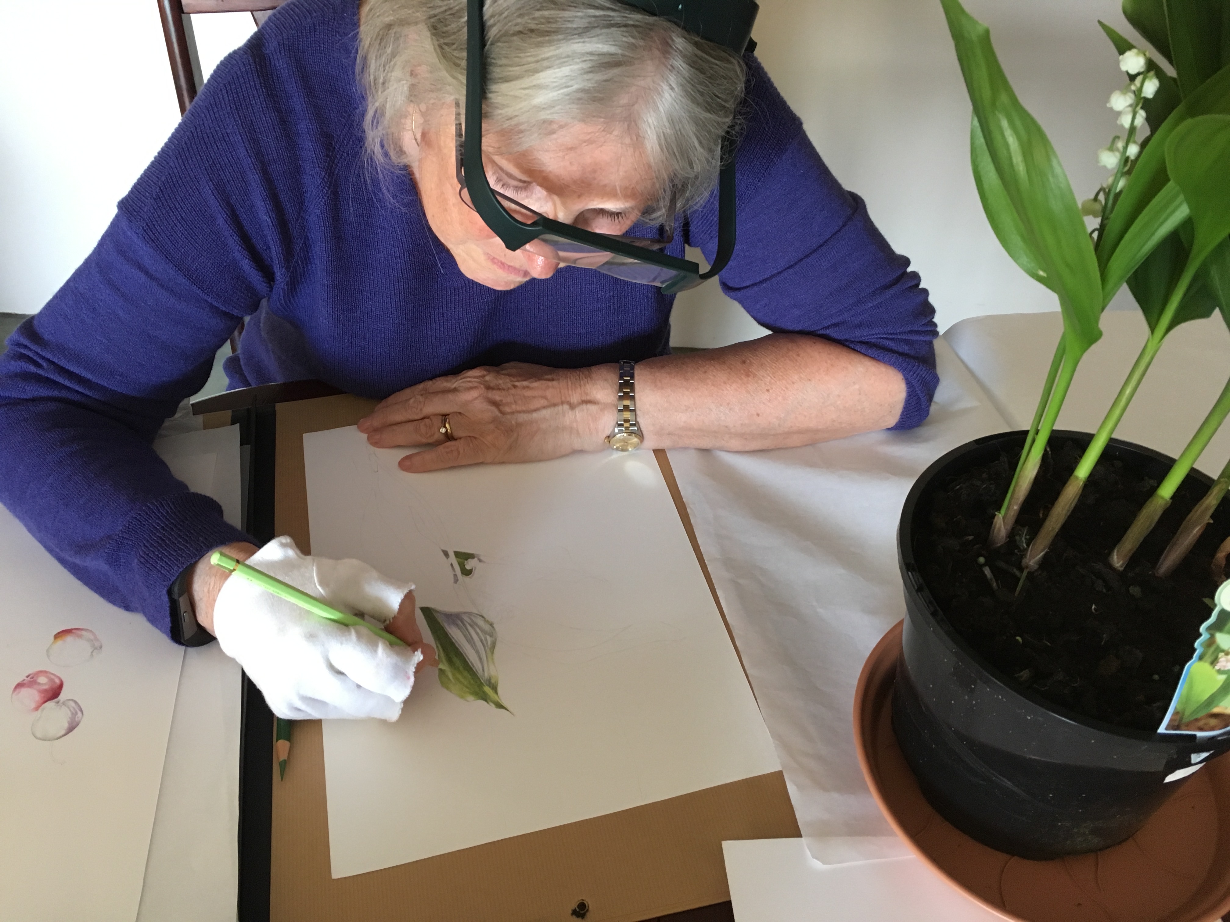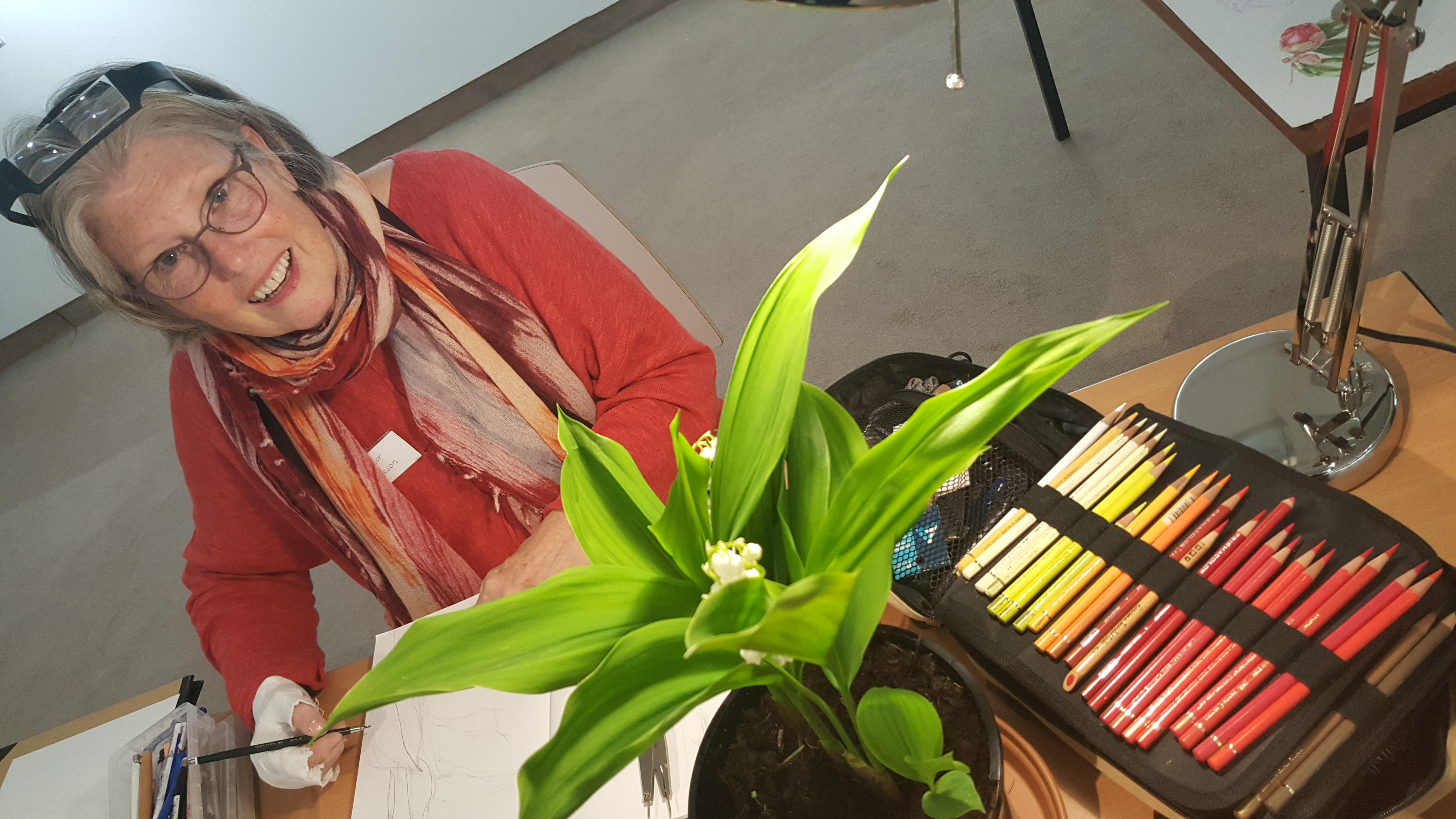 To show you a little of my own demos whilst in Lancaster I am including the unfinished picture I worked on in coloured pencil. I chose a Lily of Valley as so many people worry about white flowers. I wanted to show how best to do it. I used a lamp to highlight from the left and some of the leaves became backlit creating a beautiful architectural plant. The picture will remain unfinished as the flowers are now long gone, but it will be useful to demo on.