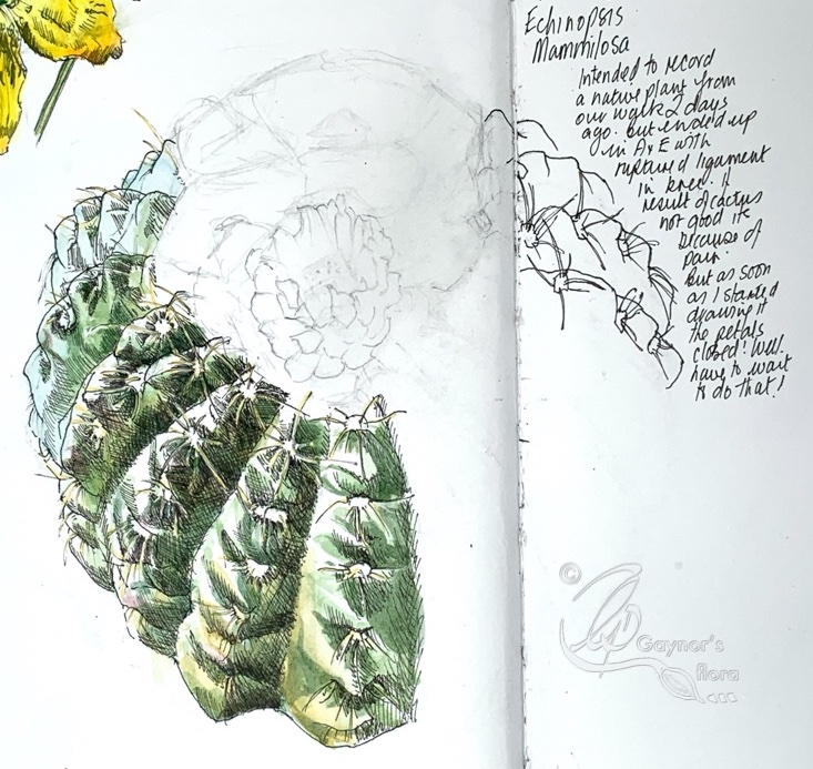 But, the reason I am showing this plant at all is because I am unable to go on walks at the moment and I am keeping a Perpetual Journal, doing a quick botanical sketch once a week. I saw the above cactus flowering in the sun and decided it would be this week’s topic. As soon as I started sketching, the sun went in and the flowers closed. They have remained closed since due to very little sun. But I did sketch some of the barrel. All I want is just one open flower to show its colour.