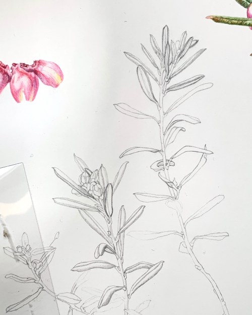 The leaves are long (relatively speaking) and narrow, leathery and curled under along the edge. I am carefully showing this first. The upper surface is veined and the colour varies from a pinky hue to a blue-green; the underside is a pale greeney-blue. But of course this doesn’t show in the graphite drawing.