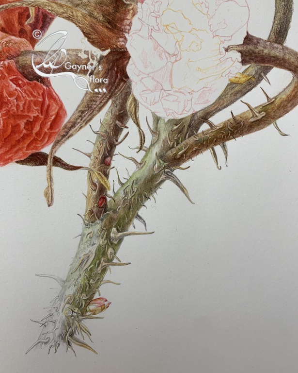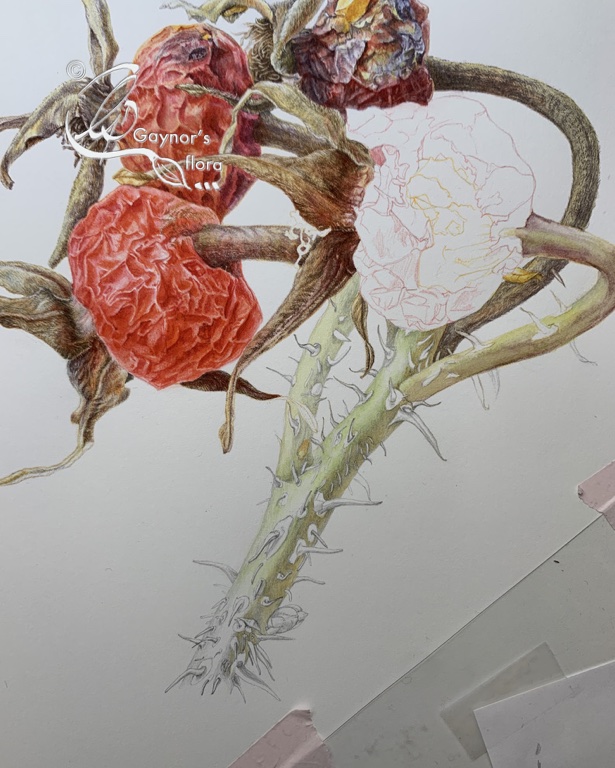 I wanted to do some of the picture in graphite, leading into the main part with the hips. Sometimes using graphite towards the background can reduce the heaviness of a picture. The stem of the Rose-hip is very prickly and therefore doing some of it with various graphite pencils made sense. I used graphite along the whole length of main stem and then colour washed part of it.