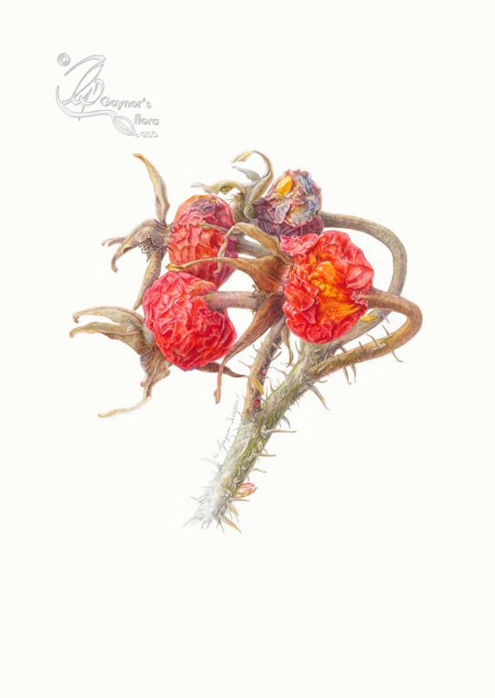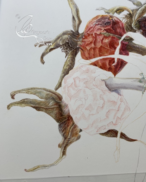 One day I was walking near the station in Tønsberg, Norway and saw some shrivelled Rosa rugosa hips in the snow. I picked one little branch thinking I might paint it on vellum. However my daughter thought I should accept a challenge outside my normal comfort zone; She felt I should portray it much enlarged on paper.