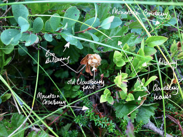 As well as the fruit appearing bluer than Bilberries, the leaves of the Bog bilberry have a slightly different shape and colour. Look at the picture above where you can see both bog bilberry and bilberry leaves side by side and further down where you also see a mix of different species.