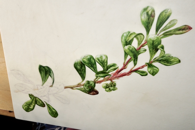 The photos above are a quick reminder of my process for this series. The various elements are traced to the vellum block and sometimes I go over these with a non-permanent watercolour outline. The main branch has generally been completed at twice the natural size and the sections in graphite or graphite and watercolour wash are normally natural size to show habit. Graphite is used to allow these sections to fall into the background making the overall picture less heavy.