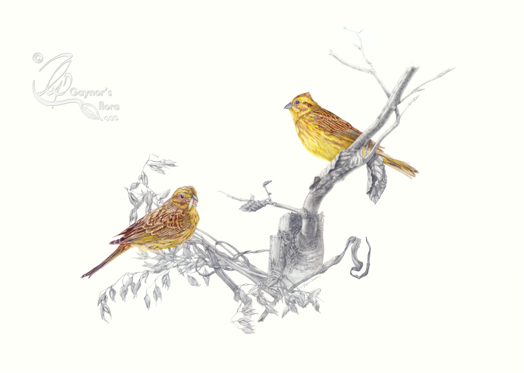 So where has this led me? It is traditional in Norway to put out sheafs of corn for the birds for Christmas. The Yellowhammers seems to be very interested in this food source and flock to the sheafs. This year, we have the corn hanging in a Beech tree, so I had both botanical subjects with the birds. Additionally, I always loved the use of graphite and didn’t start using colour in my artwork until my mid-twenties. So this picture is a combination of glowing colour for the birds and graphite for the botanical detail.