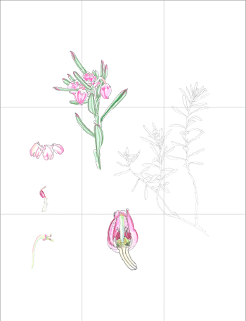 As I normally do, I studied the plant carefully, researched it and drew detailed sketches in my sketchbook. I also dissected the flower as I thought this told a story in its own right. The anthers have appendages which is typical of plants in the Ericaceae (Heather) family. Also, the petals (5) are fused into a tube. I am not a botanist, but the more I study the plants I paint or draw, I feel I always want to know more about them!