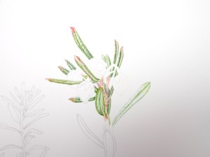 The following pictures are are photos taken at different stages, but as the painting is not finished I will need to come back with additional blogs to show you the rest of the process. By the way, the graphite line drawing in the centre is a habitat drawing showing the plant at its natural size.
