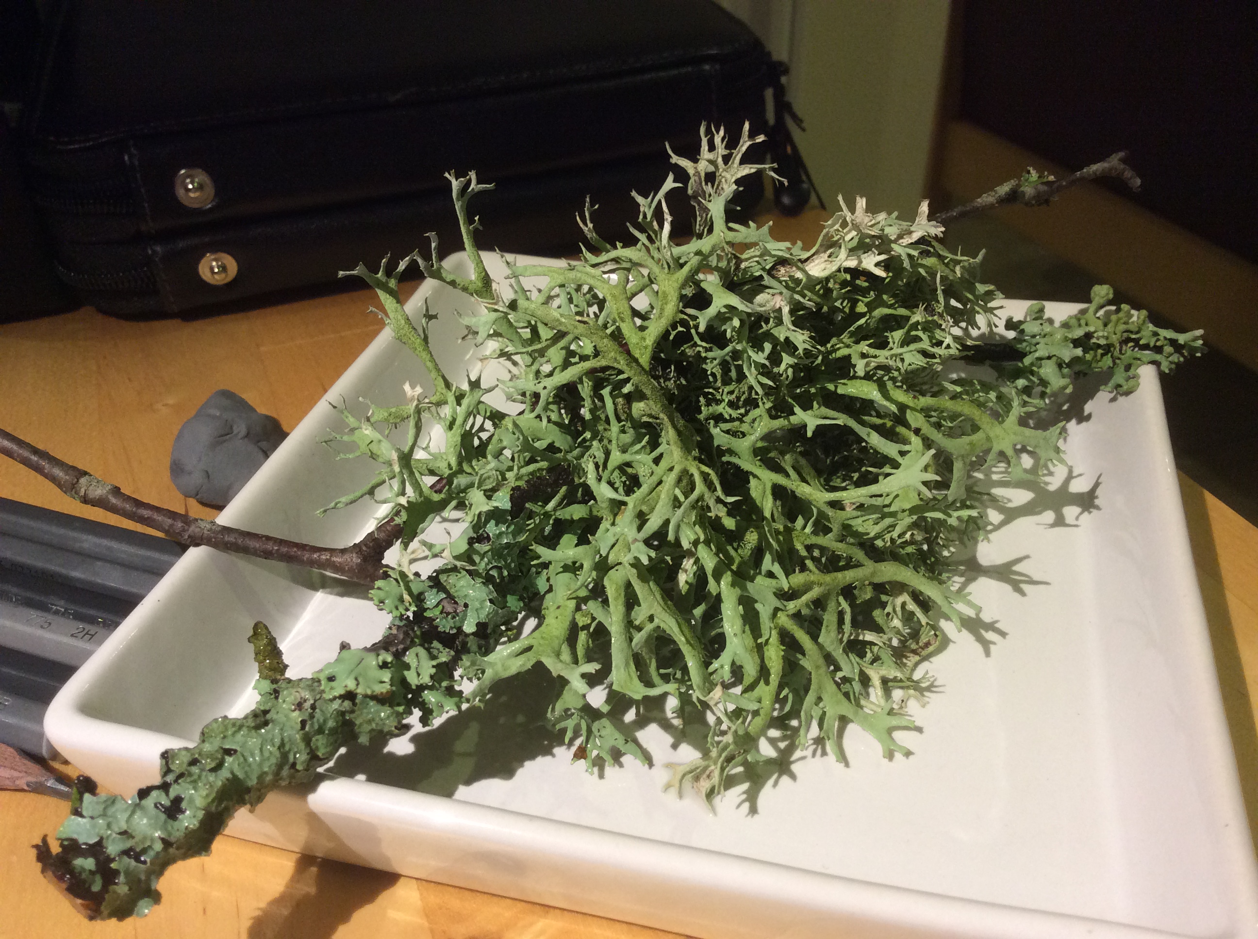 Of course the various types of lichen we had collected between us was worthy of more detailed investigation, so out came all the magnifying glasses and lenses that we could muster. The specimens were hugely intriguing and the colours definitely became accentuated when you see them in detail.