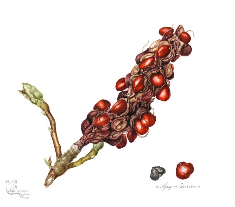 So where has this led me? It is traditional in Norway to put out sheafs of corn for the birds for Christmas. The Yellowhammers seems to be very interested in this food source and flock to the sheafs. This year, we have the corn hanging in a Beech tree, so I had both botanical subjects with the birds. Additionally, I always loved the use of graphite and didn’t start using colour in my artwork until my mid-twenties. So this picture is a combination of glowing colour for the birds and graphite for the botanical detail.