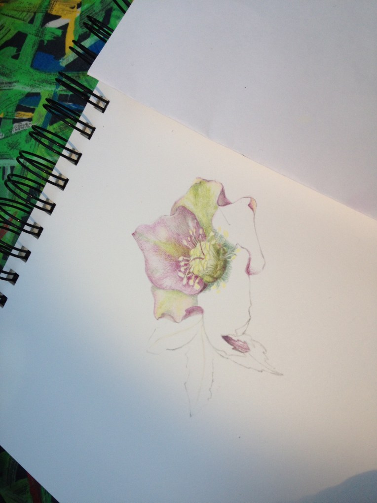 There was a botanical art class between Friday and Sunday. The title was May blossom and Irises. Irises are usually the topic of choice, but there was a whole garden to choose from. In the end there were 1 1/2 Iris pictures, two Canary Rose pictures, one crab apple blossom, a very pregnant Hellebore and none of the yellow Irises from the pond. Three people used coloured pencil and two watercolour.