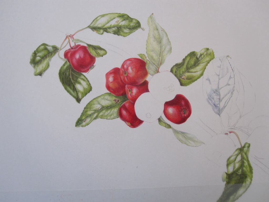 I haven’t got new pictures of this painting, but here you can see the notes from my flower dissections in my sketch book. Peeking out from under the sketchbook you can just see some completed leaves on a branch contain gripe crab apples.