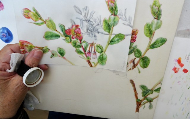 The photos above are a quick reminder of my process for this series. The various elements are traced to the vellum block and sometimes I go over these with a non-permanent watercolour outline. The main branch has generally been completed at twice the natural size and the sections in graphite or graphite and watercolour wash are normally natural size to show habit. Graphite is used to allow these sections to fall into the background making the overall picture less heavy.