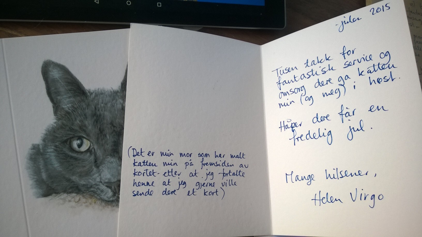 Helen has just sent this picture as she is about to post the card. Now you can guess that it is written in Norwegian, therefore most will not understand what it says. I just thought it looked rather sweet with Tigger seemingly peeping round the edge of of the card.